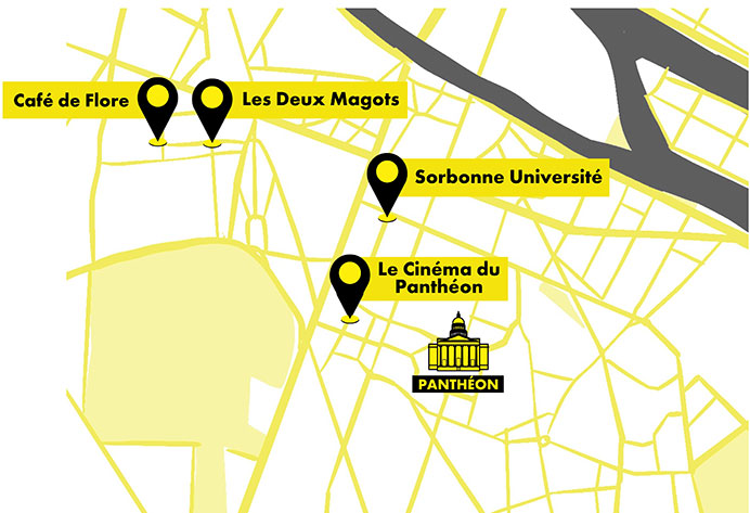Known Sartre hot-spot Map of the Boulevard Saint-Germain, with our five gems marked