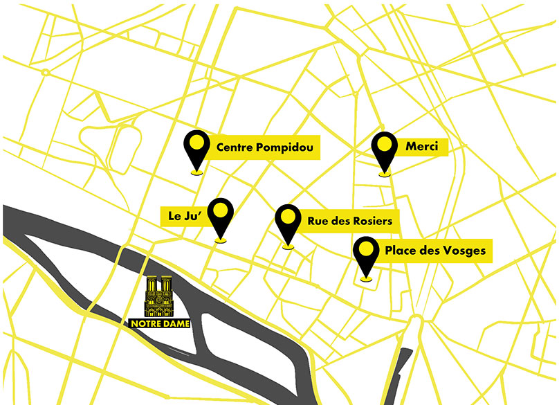 Marais all day, baby Map of Le Marais neighborhood in Paris, with our five gems marked