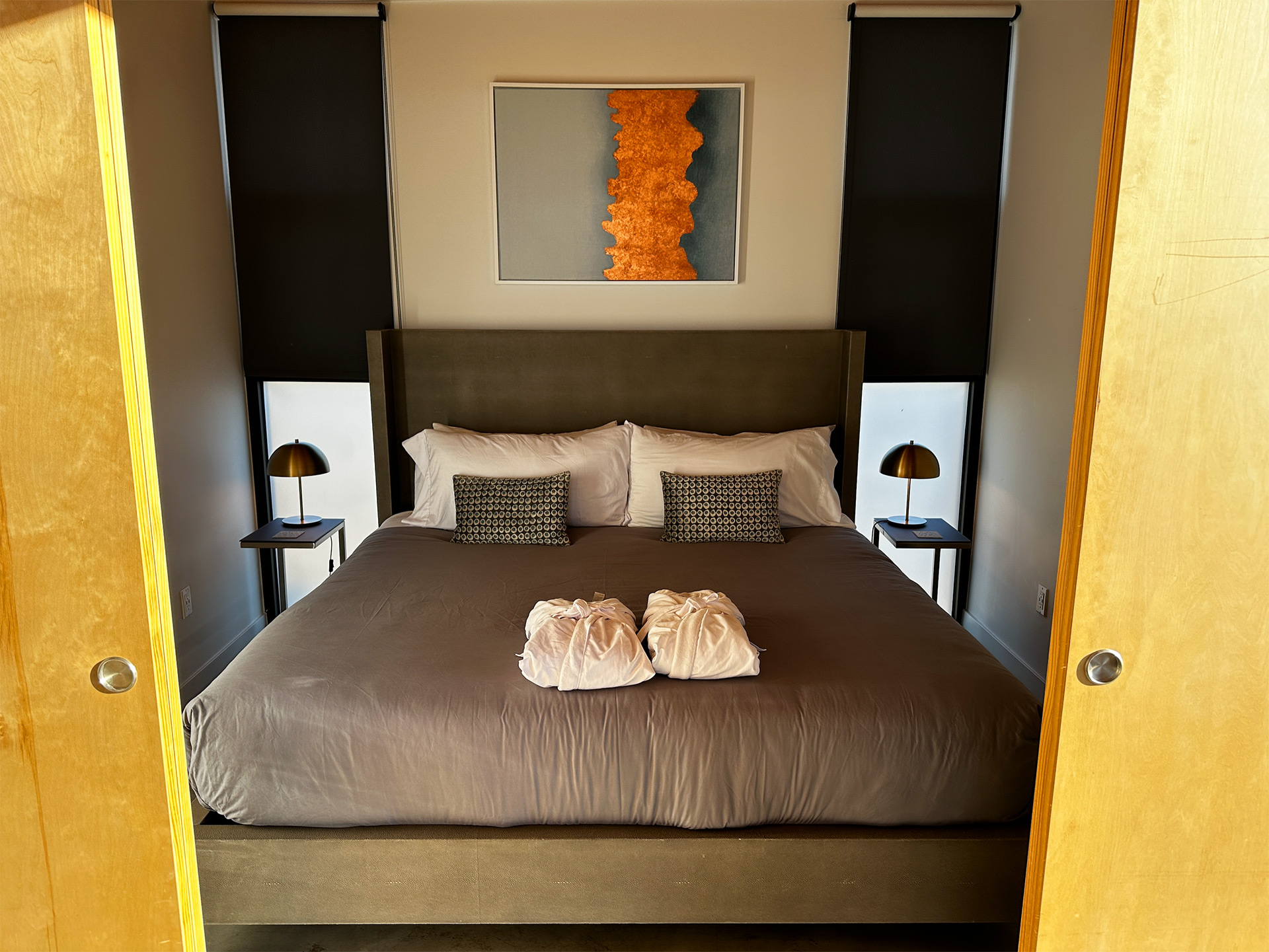 Cave B Cabins feature Olson Kundig’s signature minimalist design with concrete, steel, and plywood elements. Each cabin has a full kitchen, modern bath, and private outdoor seating.