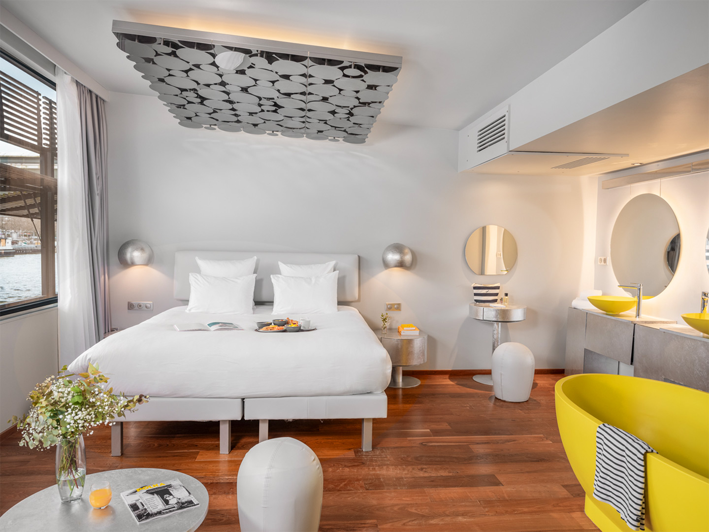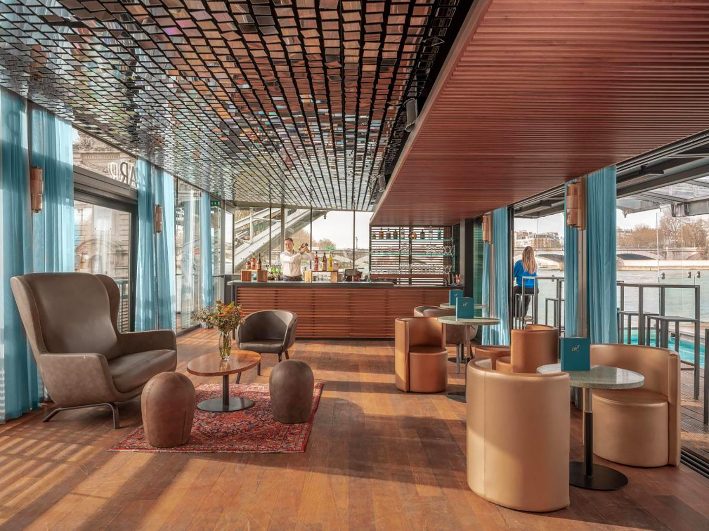 A floating 54-room boutique hotel on two barges, blending modern design with a unique Seine-side experience. Features include a small pool and a rooftop bar for riverside relaxation.