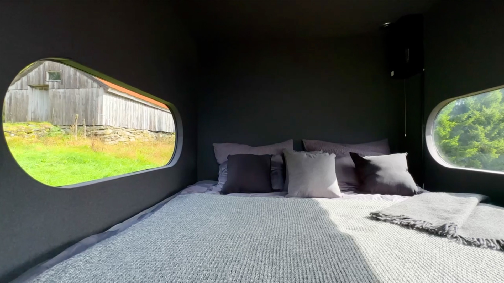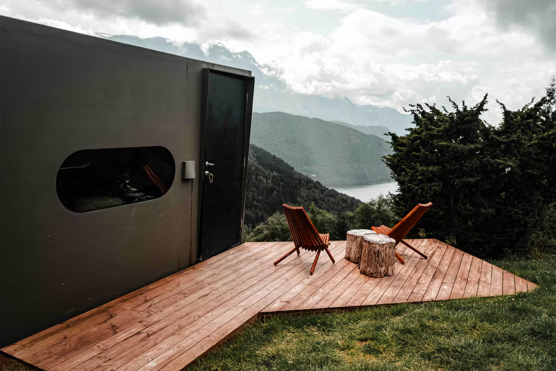 A modern tiny house perched on a mountaintop outside Førde, Norway. The Birdbox offers spectacular views of the Blegja mountain range and Førdefjord—perfect for nature lovers seeking a minimalist, sustainable getaway.